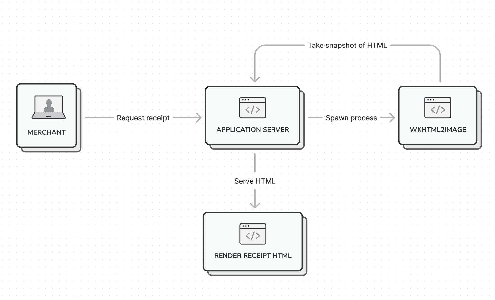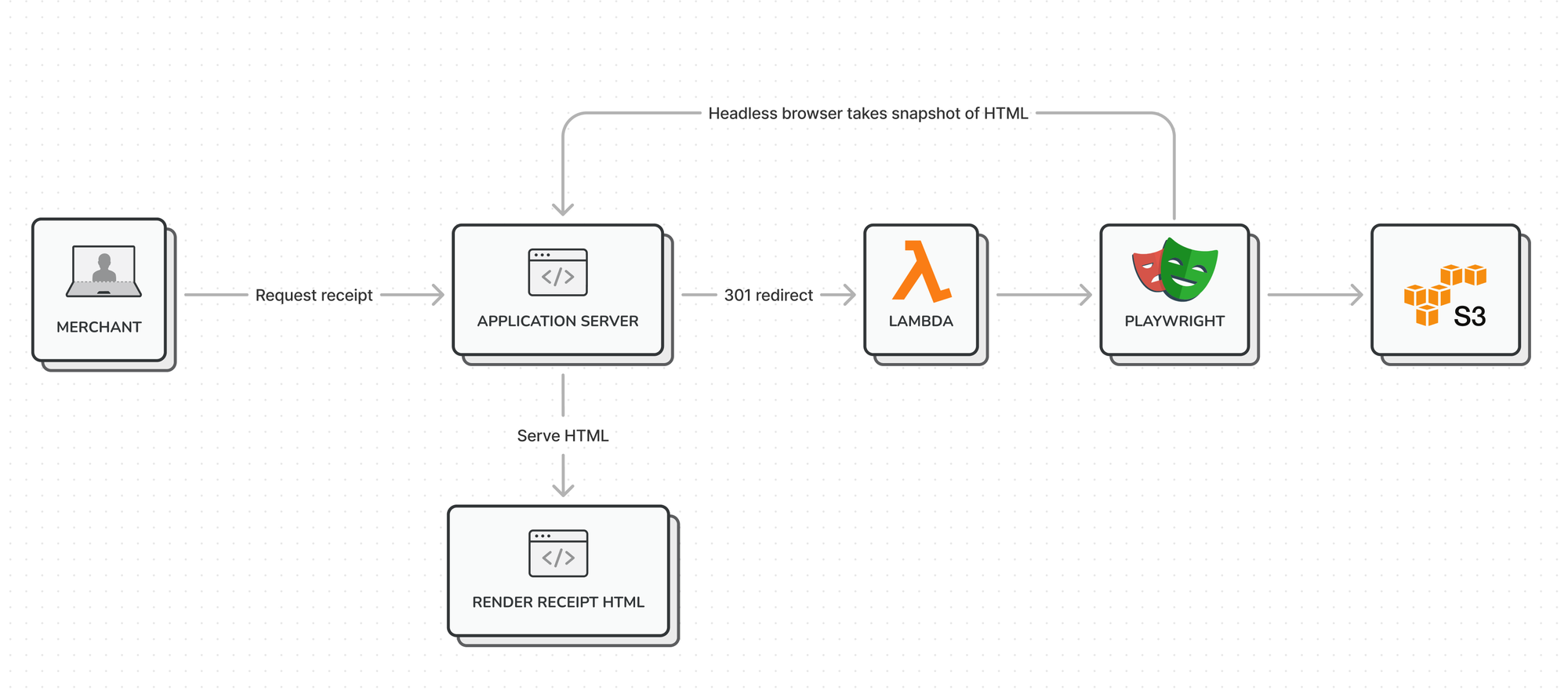 Whenever a receipt was requested, a Lambda would spin up a headless version of Google Chrome, take a screenshot of the HTML page, and store the resulting image on an S3 bucket and return an URL that pointed to this screenshot.